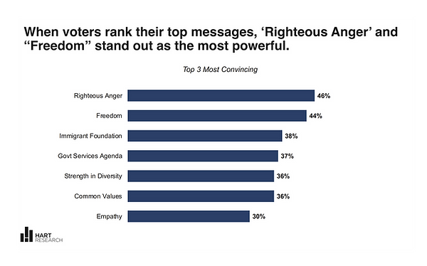 According to the survey, the counter-messaging that works best is strong “callouts of politicians’ divisive fearmongering.” Examples that tested well with voters includes: